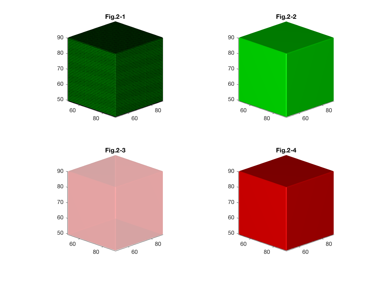 'patch' also accepts separately specified faces and vertices apart from accepting a whole surface object created by 'isosurface' function (See Fig. 2-4 which presents similar cube as Fig. 2-2).