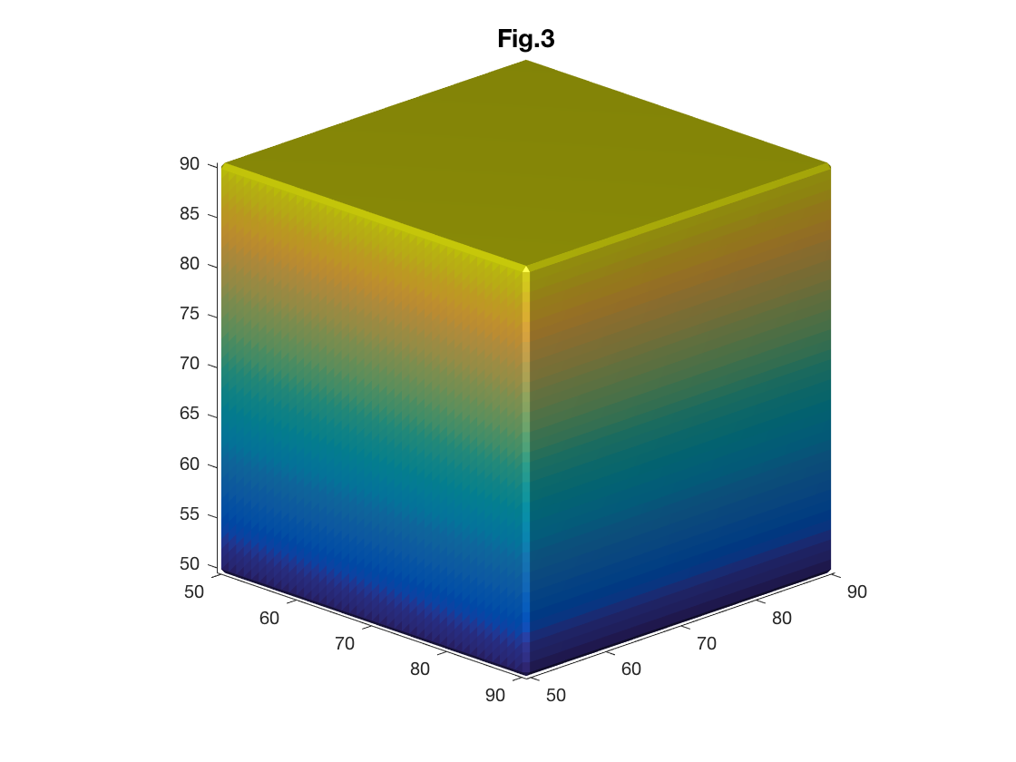 % patch('Faces',myCubeSurface.faces,'Vertices',myCubeSurface.vertices,'FaceVertexCData',colorCode,'FaceColor','interp','EdgeColor','none','EdgeLightin','flat');